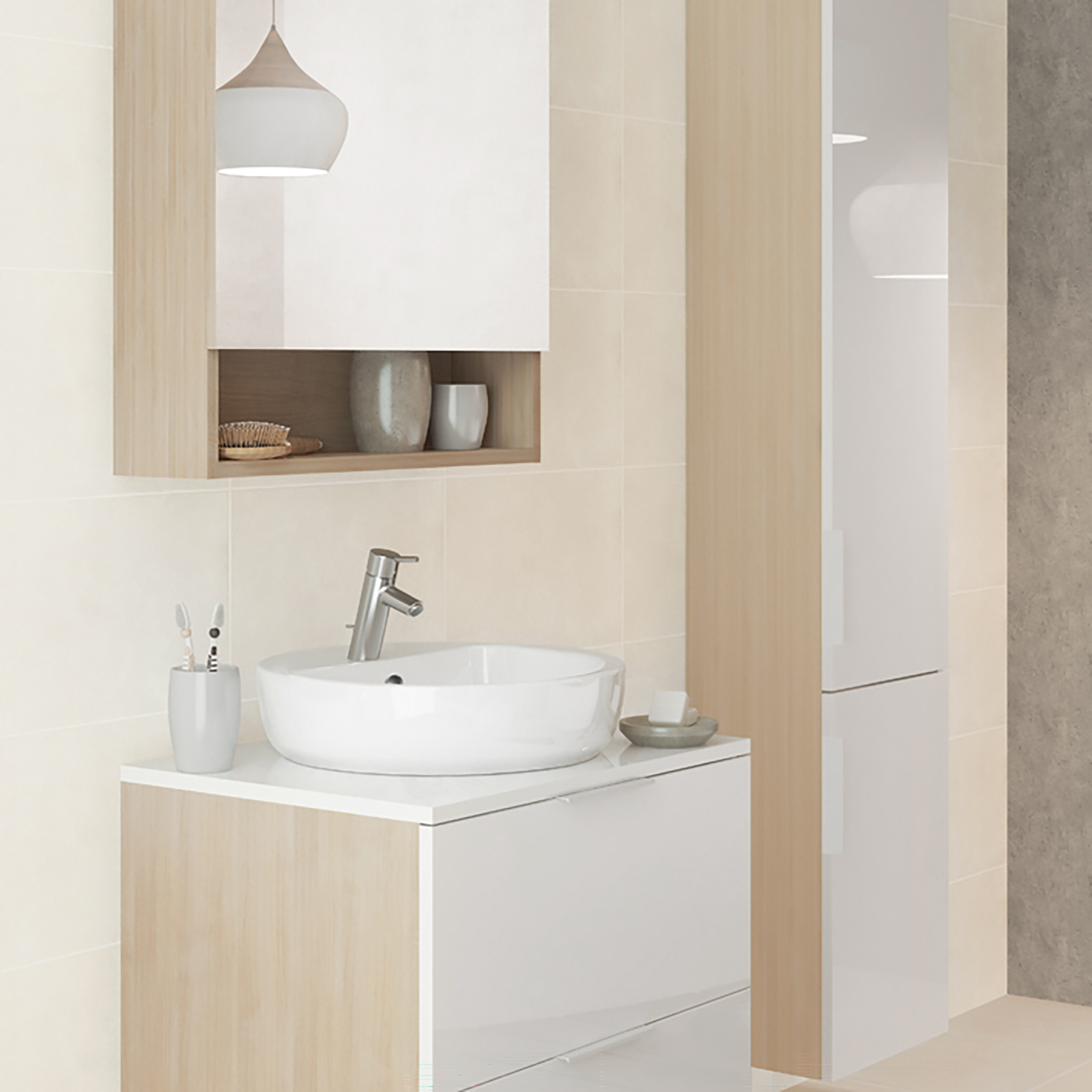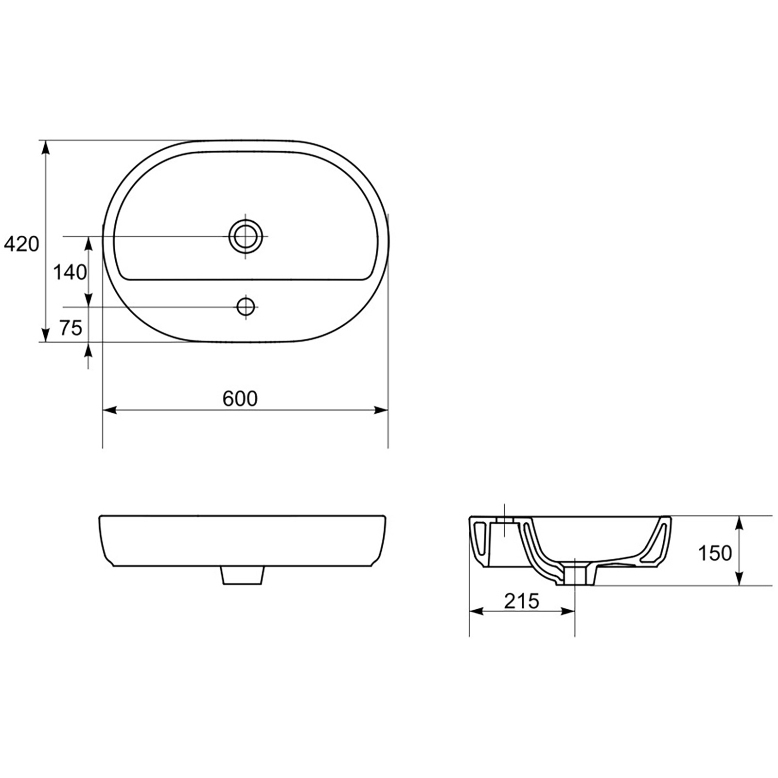 Das CASPIA OVAL 60 Waschbecken hat eine ovale Schüssel und ein zentral gelegenes Loch für die Armatur und den Überlauf. Der Waschtisch kann auf einer Arbeitsplatte oder mit einem STILLO 80 Schrank montiert werden. Eine Schablone zum Ausschneiden der Befestigungslöcher liegt bei.
