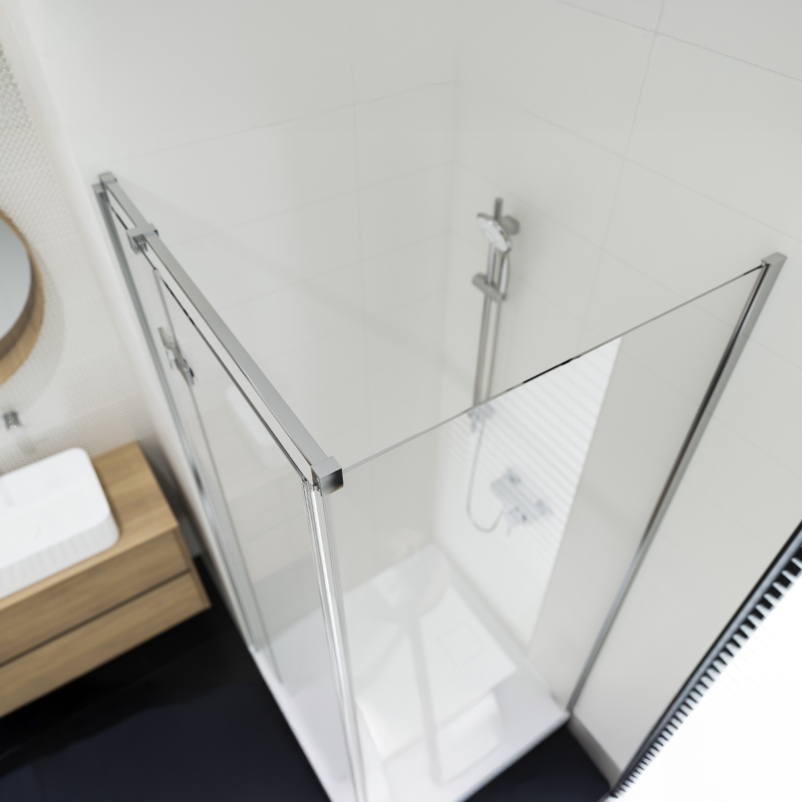 Jota ist eine Kollektion von rahmenlosen Duschkabinen, die viele nützliche Lösungen für den Benutzer bietet. Das Glasscharnier mit Liftfunktion macht die Duschabtrennung leicht sauber zu halten, während die CleanPro-Beschichtung von 3M die Reinigung von Schmutz und Kalkablagerungen noch einfacher macht. Der Metallgriff, das Metallscharnier, die Schwellerleiste und die Möglichkeit der Bodenmontage sind weitere Highlights dieses Produkts.