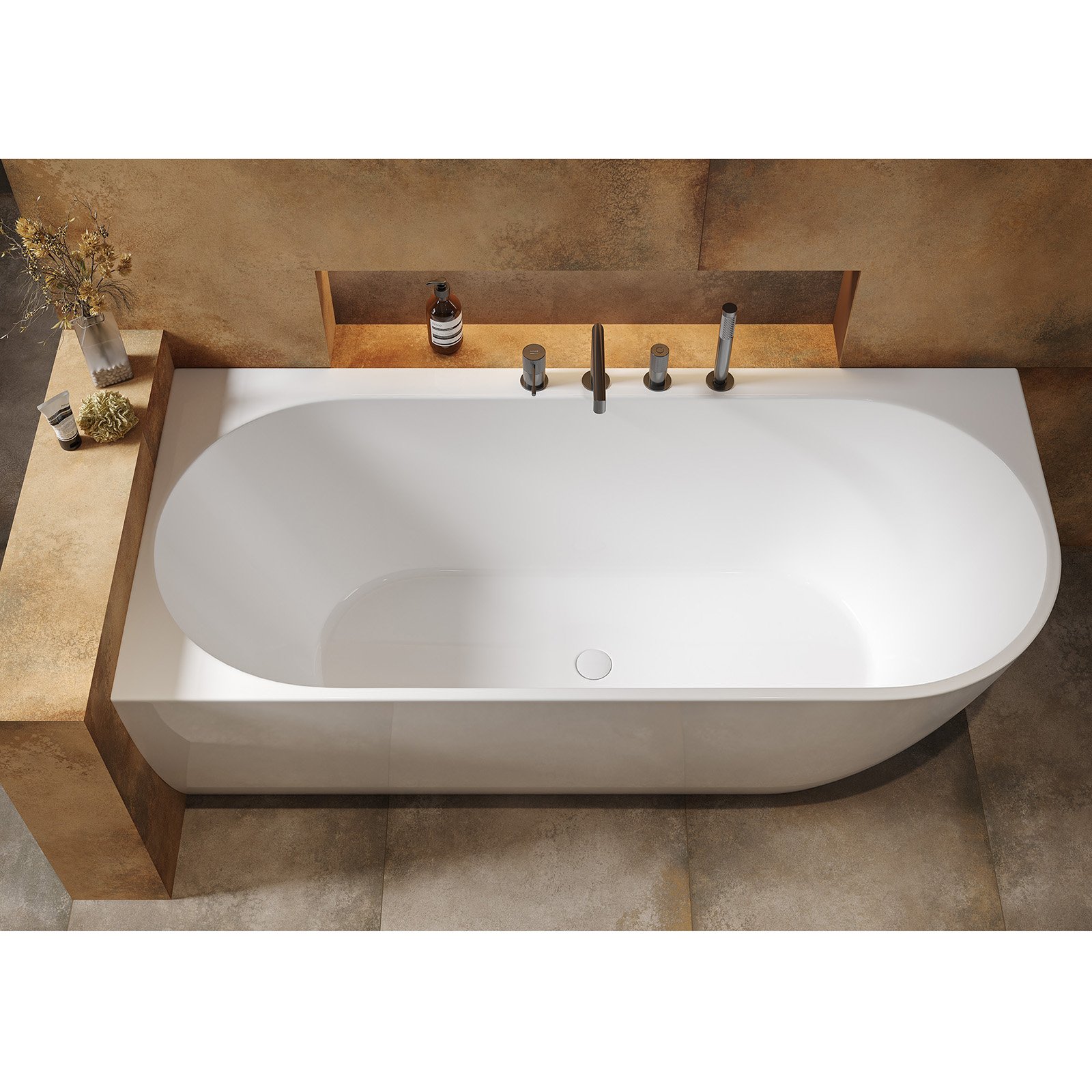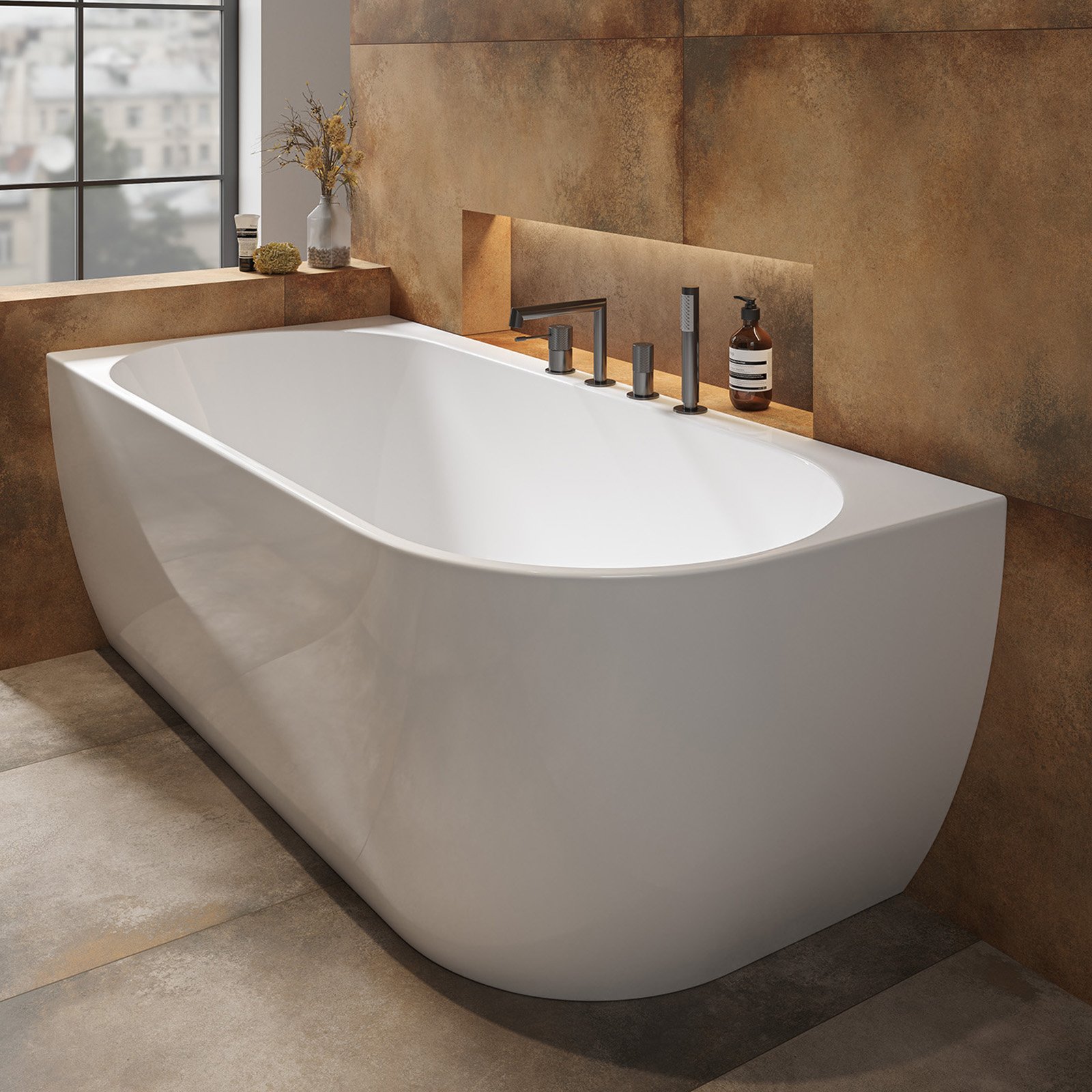 Die freistehende GARDA-Eckbadewanne ist eine Lösung für alle, die die monolithische Schönheit einer freistehenden Badewanne mit einem funktionalen Aspekt bei der Anordnung des Badezimmerraums verbinden möchten. Eine freistehende, wandmontierte Badewanne ermöglicht die Verwendung sowohl wandmontierter als auch von Badewannenarmaturen – es ist möglich, Löcher in den Badewannenrand zu bohren. Das Produkt verfügt außerdem über einen bequemen Platz für Badeutensilien in Form eines bequemen Regals neben der Wand. Für die Herstellung des Produkts wurde Acryl von ausgezeichneter Qualität verwendet – ein Material, das das Geräusch des aufschlagenden Wassers dämpft und die Oberfläche der Badewanne warm und angenehm berührt. Die angenehme Badetemperatur hält länger. Neben ihrer robusten Bauweise zeichnet sich die freistehende Acrylbadewanne durch ihr Gewicht aus, das geringer ist als das von Konglomeratprodukten. Das Set enthält einen Klick-Klack-Siphon in Weiß und einen Rahmen mit verstellbaren Beinen.