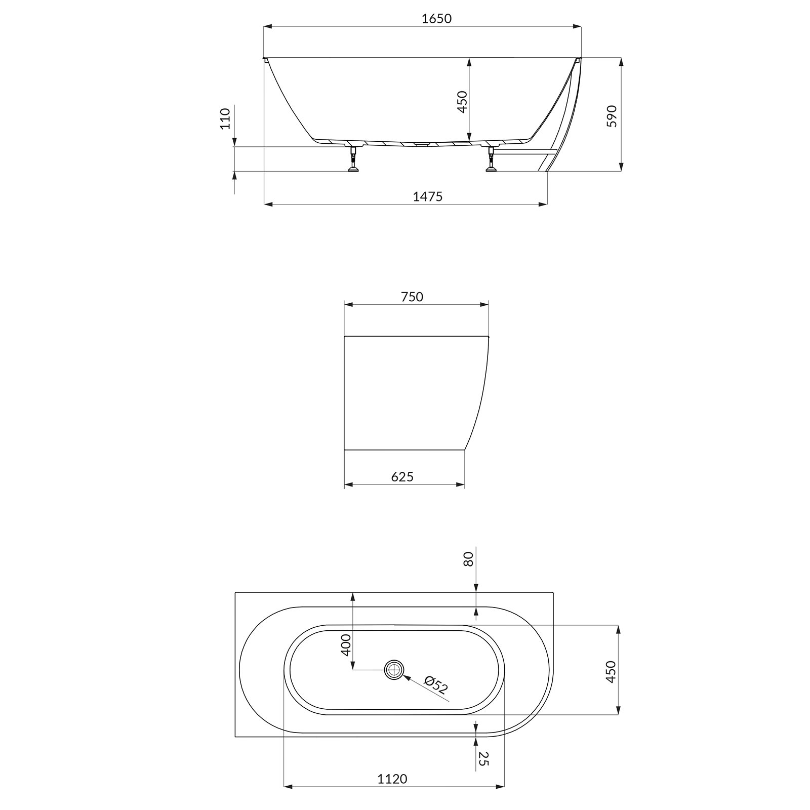 Freistehende Badewanne GARDA-Ecke links weiß 165x75.