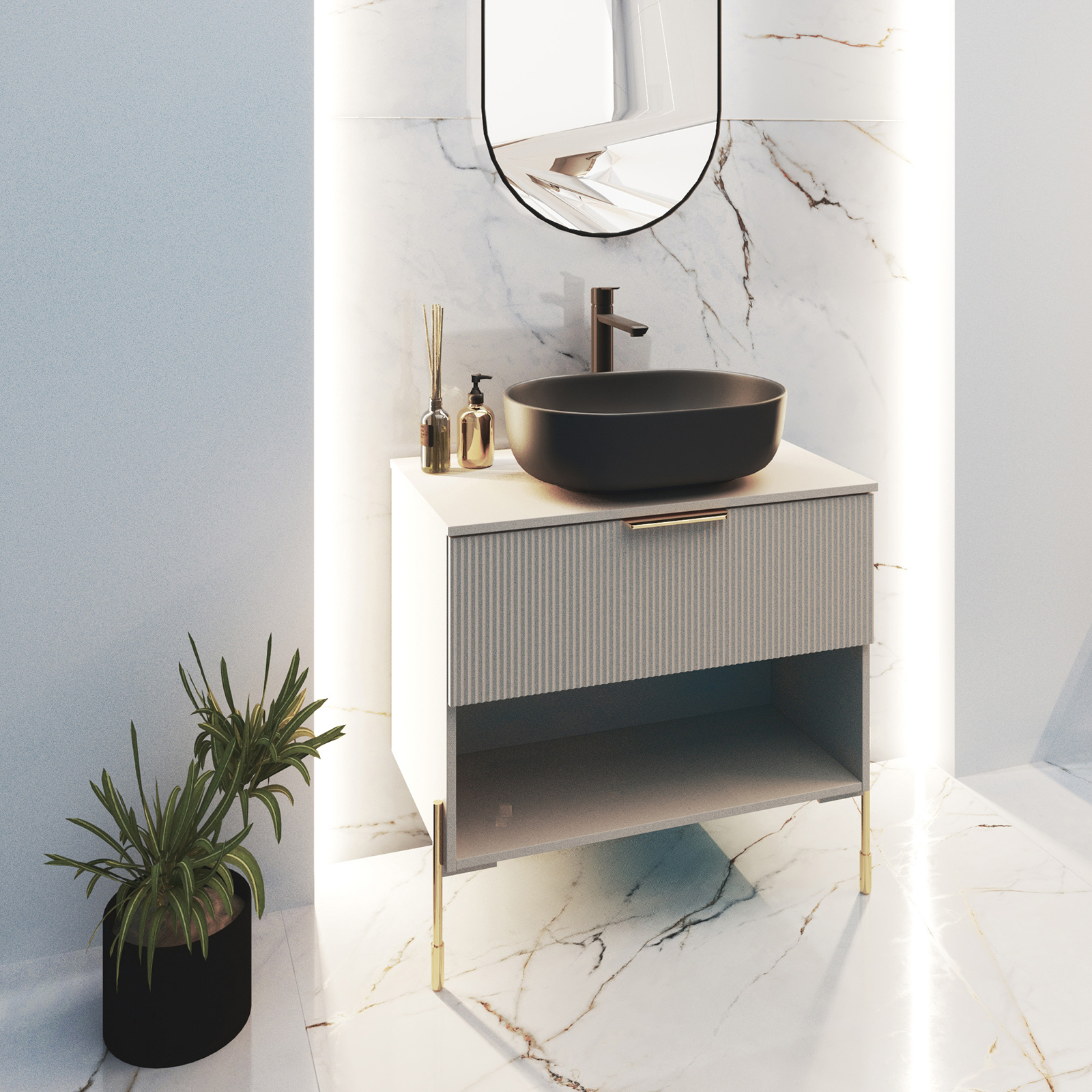 Der lange Griff NAVADO erleichtert nicht nur das Öffnen größerer Schränke, sondern dient auch als subtil dekoratives Element. Das goldene Finish setzt einen eleganten Akzent und fügt sich perfekt in sowohl minimalistische als auch aufwendigere Arrangements ein.