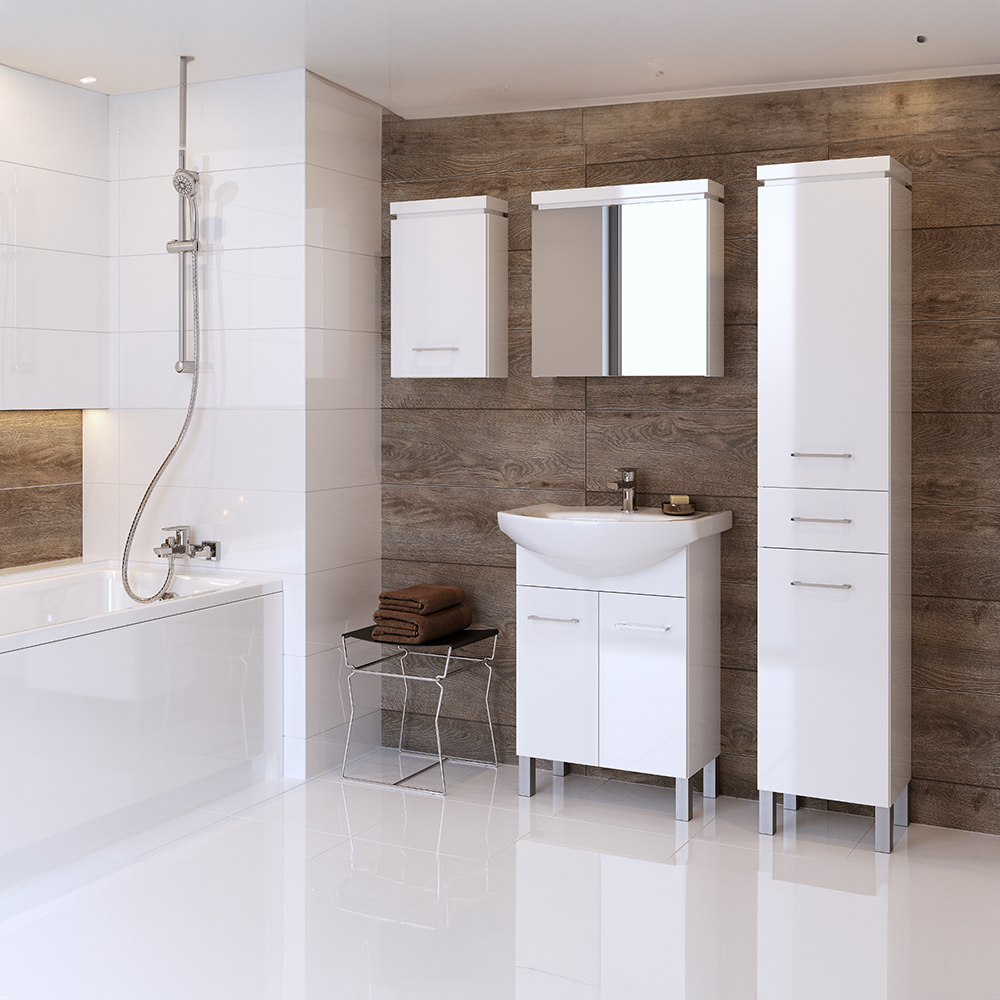 Der Schrank ist aus beschichtetem Spanholz in Hochglanz gefertigt. Er verfügt über Metallfüße und zweitpunktige Griffe in Chromfarbe. Im Inneren des Schranks befindet sich ein Regal, das notwendige Badezimmerartikel aufnehmen kann, und er ist mit doppelten Türchen verschlossen. Der Schrank ist für die Selbstmontage vorgesehen.