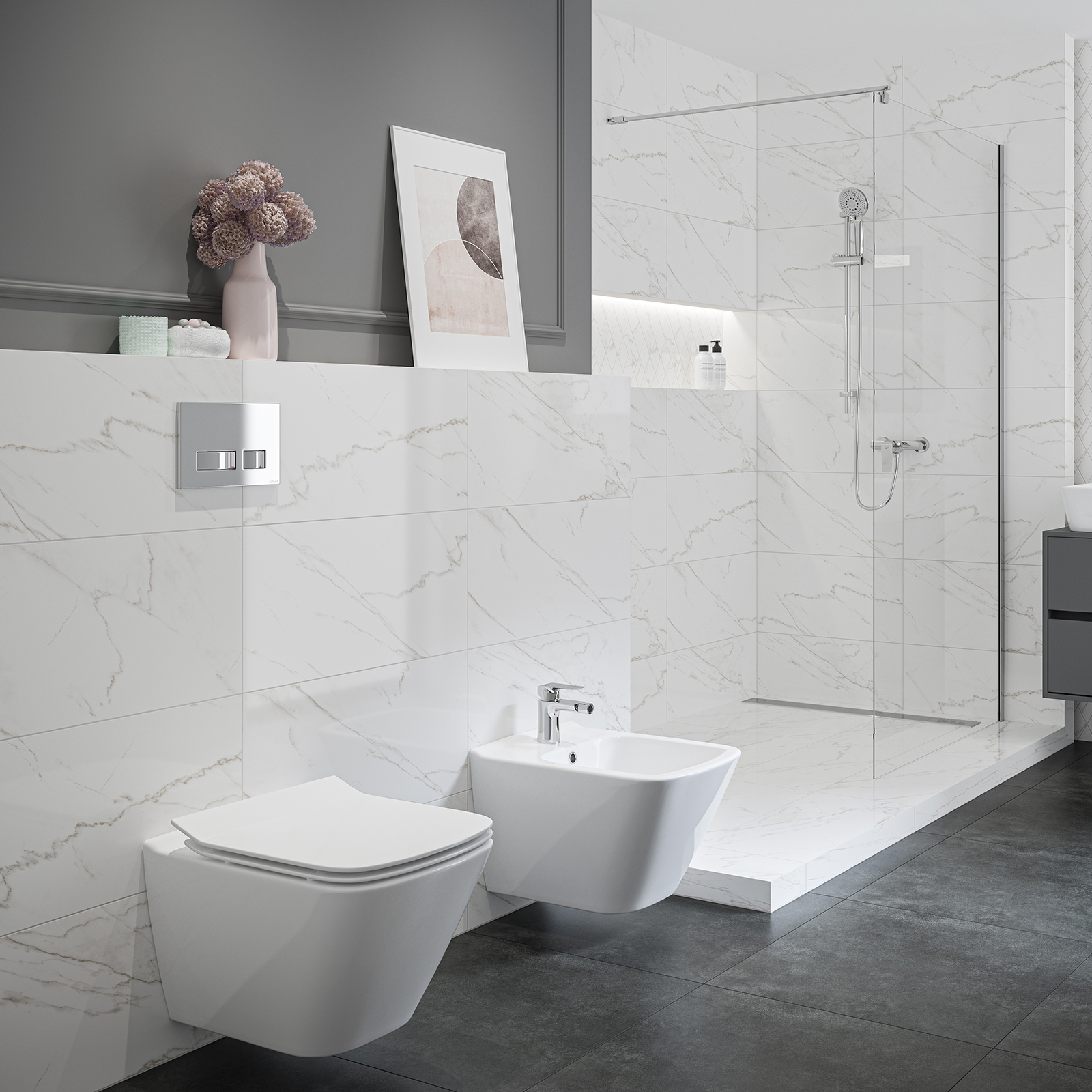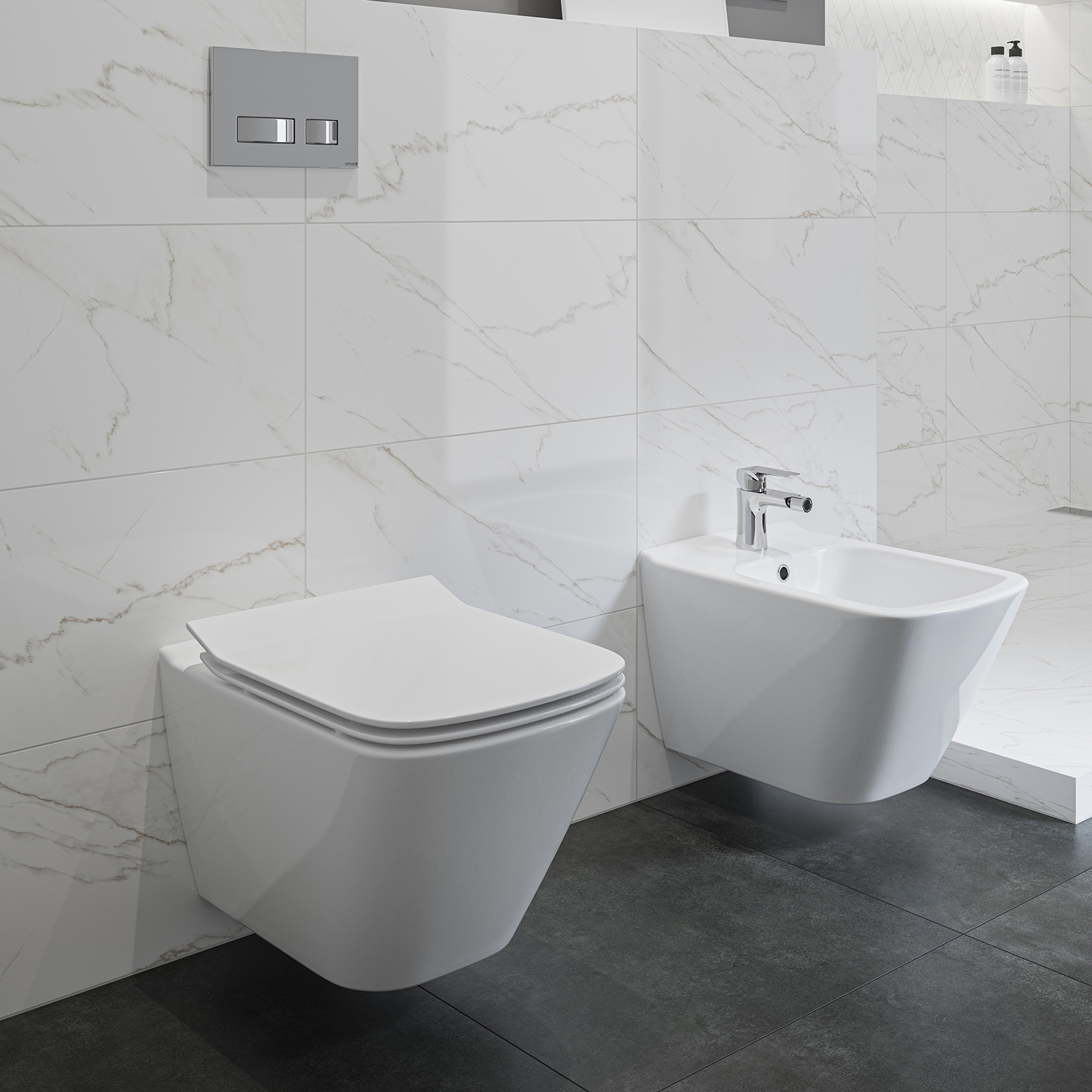 Die hängende Toilettenschüssel CITY SQUARE hat ein verdecktes Montagesystem, das die Ästhetik verbessert und die Installation erleichtert. Er ist mit der innovativen CleanOn-Technologie ausgestattet, die für Hygiene und sichere Anwendung sorgt. Es sorgt dafür, dass das Wasser beim Spülen die gesamte Innenfläche der Schale gründlich reinigt und sie sauber und frisch hinterlässt. Kein Kragen bedeutet auch, dass sich keine Bakterien und Keime ansammeln können. Die Schüssel ist für eine sparsame 3/5-Liter-Spülung ausgelegt, was Wasser spart. Zum Set gehört ein dünner, freischwebender VIRGO CITY SQUARE Sitz mit Easy-Release-Funktion.