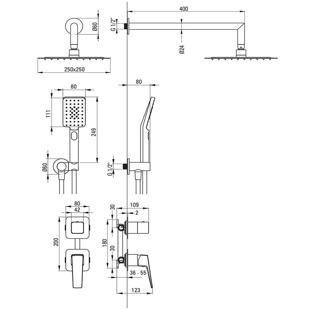 bündig montiertes Duschset Ein elegantes, bündig montiertes Duschset, bestehend aus einem Kopf, einem Duschkopf mit schrägem Anschluss sowie einem Schlauch und einem Wasserhahn. Der quadratische Sprühkopf sorgt für einen gleichmäßigen, angenehmen Wasserfluss für ein entspannendes Badeerlebnis. Hergestellt aus hochwertigen Materialien, ist es langlebig und korrosionsbeständig. Das Set ist außerdem mit einem versteckten Wasserhahn ausgestattet, der einen ergonomischen Hebel bietet, mit dem Sie die Temperatur und Intensität des Wasserstrahls präzise einstellen können. Das Ganze ist mit Chrom versehen und passt perfekt zu modernen und klassischen Badezimmereinrichtungen. Dank des bündig montierten Designs sind die Installationselemente dezent verborgen, was dem Badezimmer ein minimalistisches und ordentliches Aussehen verleiht.