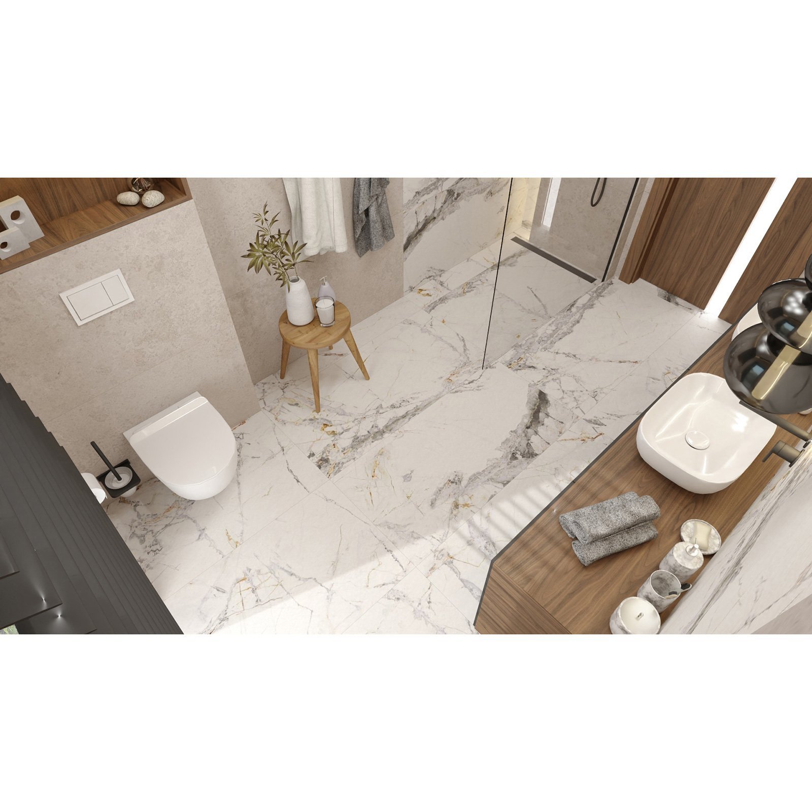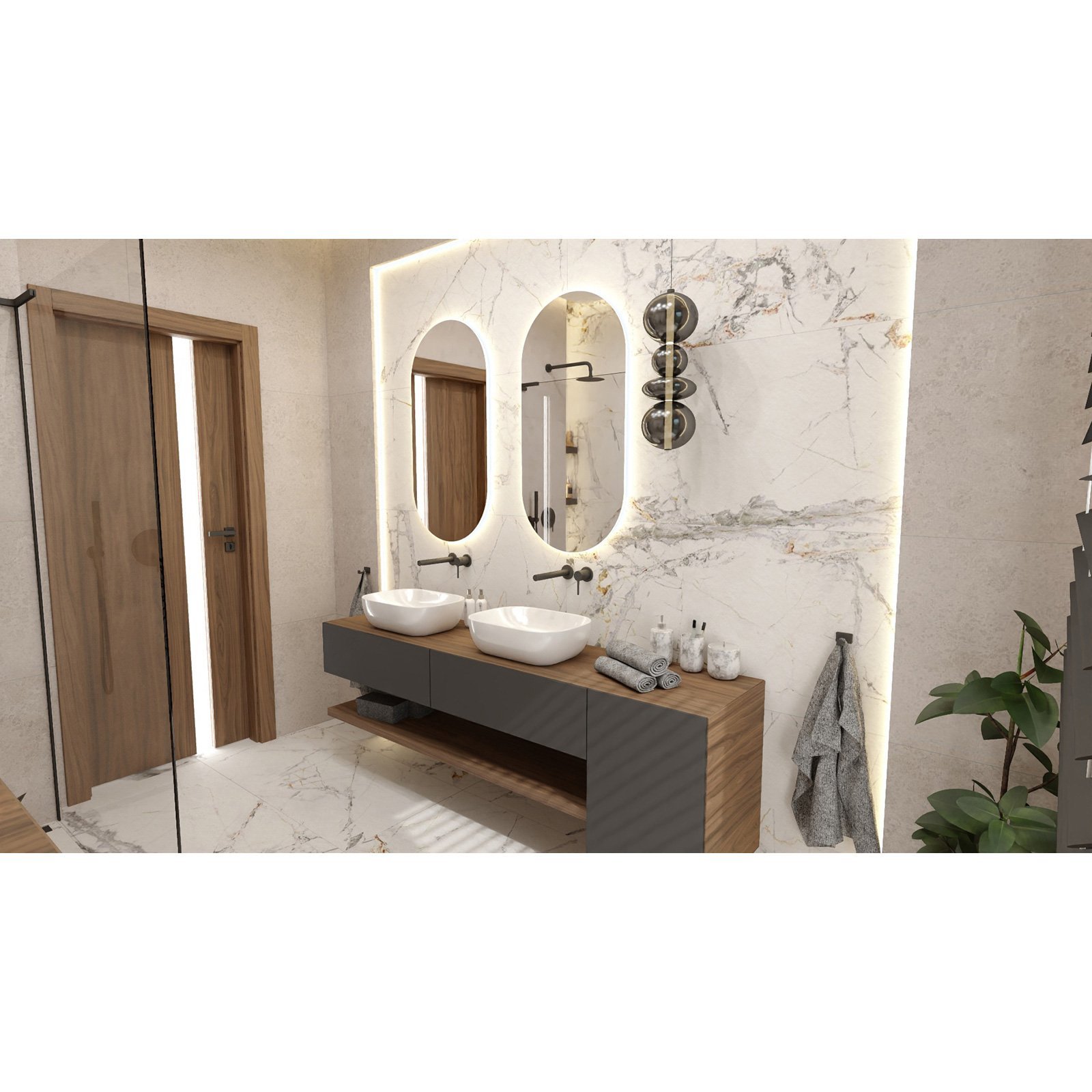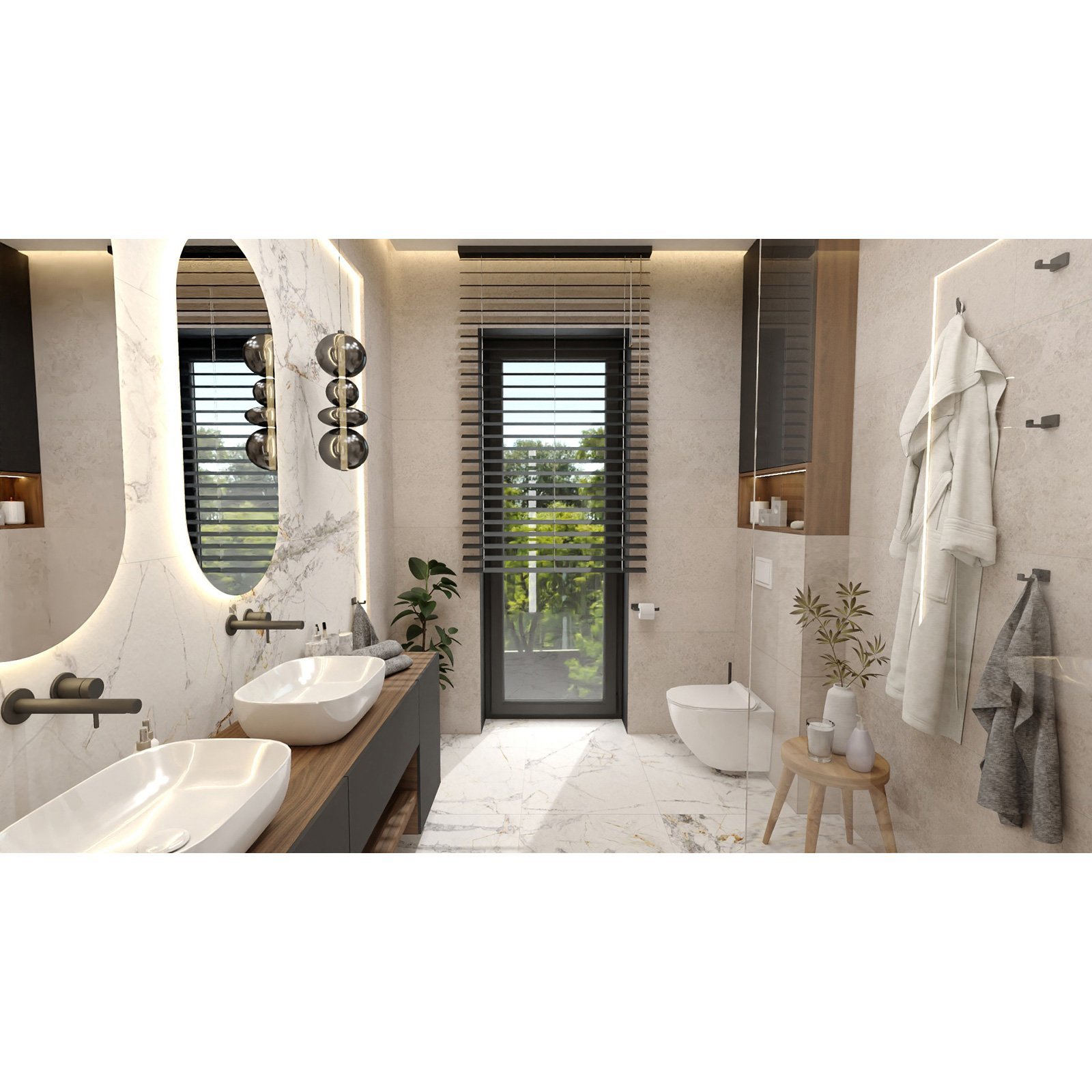 Das Waschbecken der Arbeitsplatte Gulia zeichnet sich durch einen rechteckigen Sockel mit leicht abgerundeten Seiten aus. Die schneeweiße Farbe dieses Modells macht es zu einer perfekten Ergänzung für moderne oder skandinavische Innenräume.