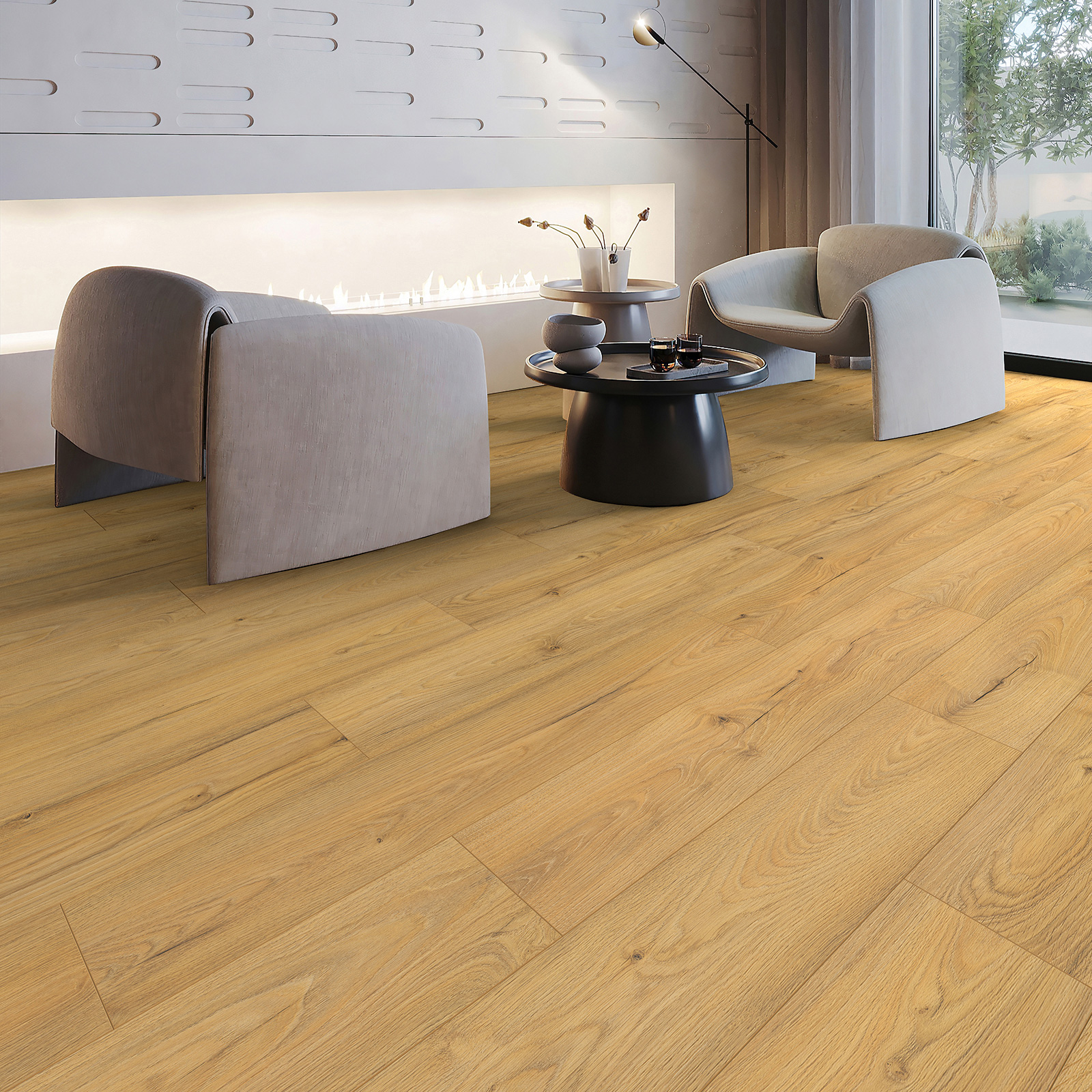 KRONOSPAN Laminatböden sind dank einer besonders langlebigen Oberflächenoberfläche widerstandsfähig gegen Schläge, Stöße, Kratzer, Abrieb und Druck. Der Boden verliert seine Farbe nicht und verblässt nicht unter direkter Sonneneinstrahlung – die Böden sind UV-resistent. Die Böden sind schnell und einfach zu verlegen.