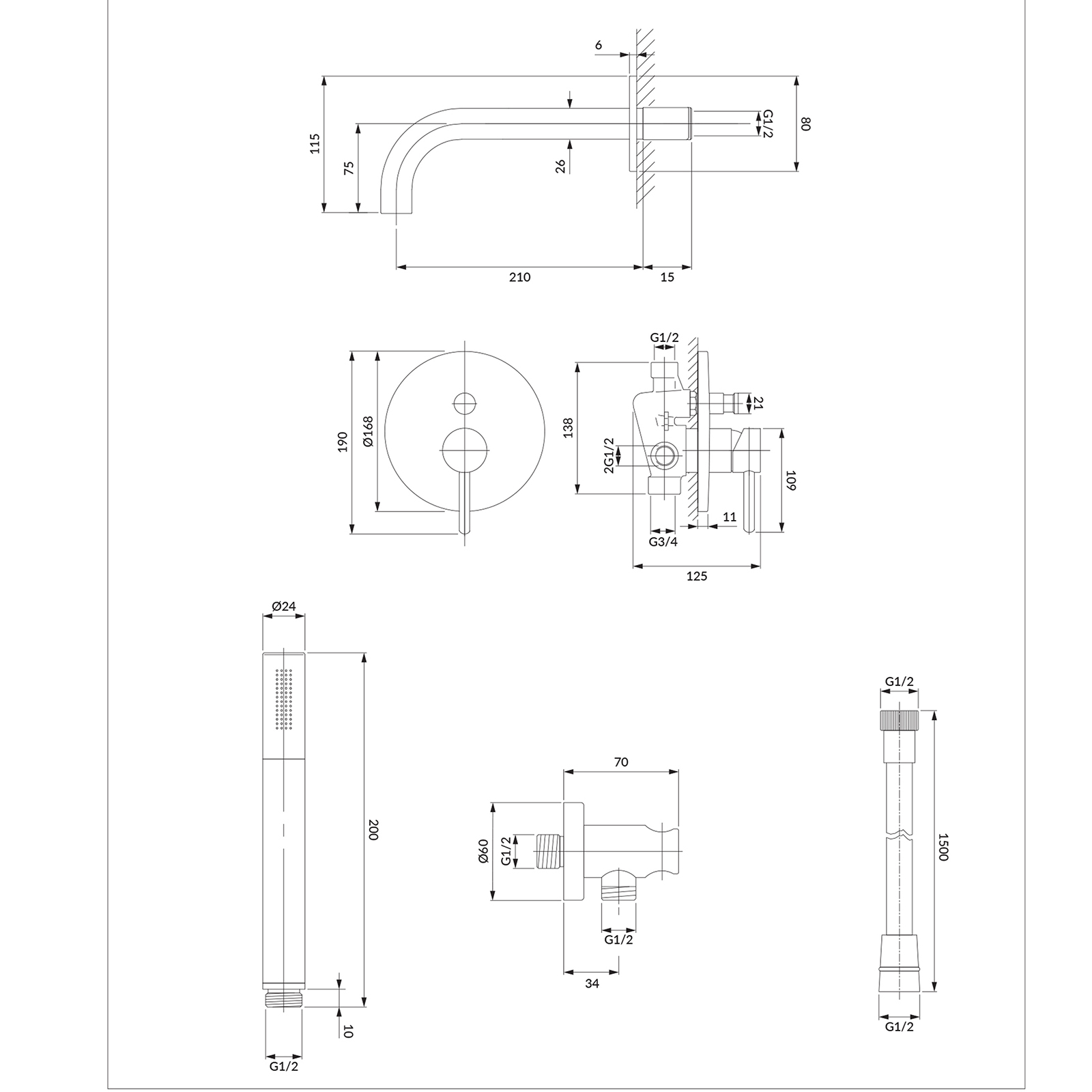 - wandmontierter Badewannenauslauf (WDYGR), Auslaufbereich: 21 cm