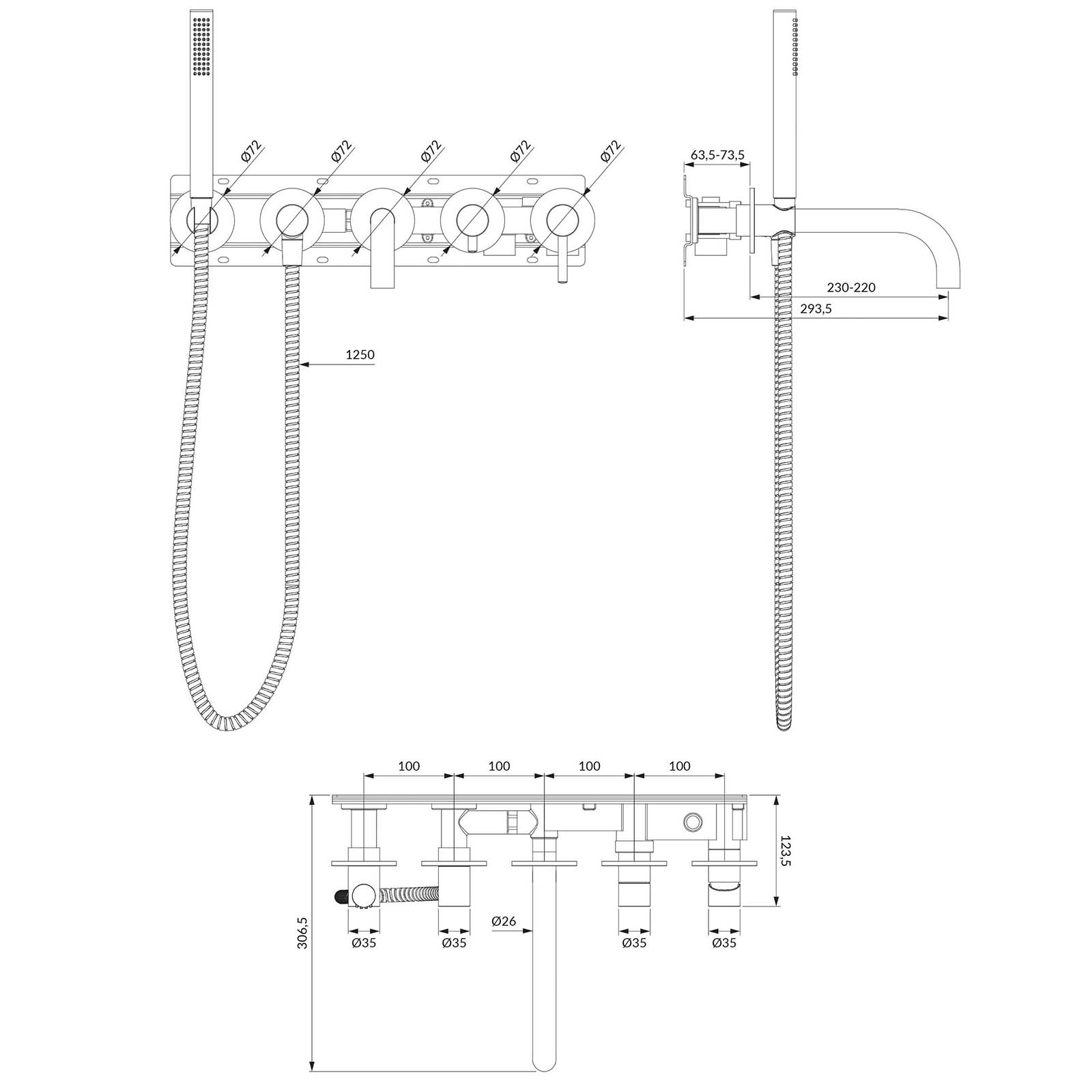 - zwei Eingänge (für Warm- und Kaltwasser): 1/2" Messing-Duschgriff