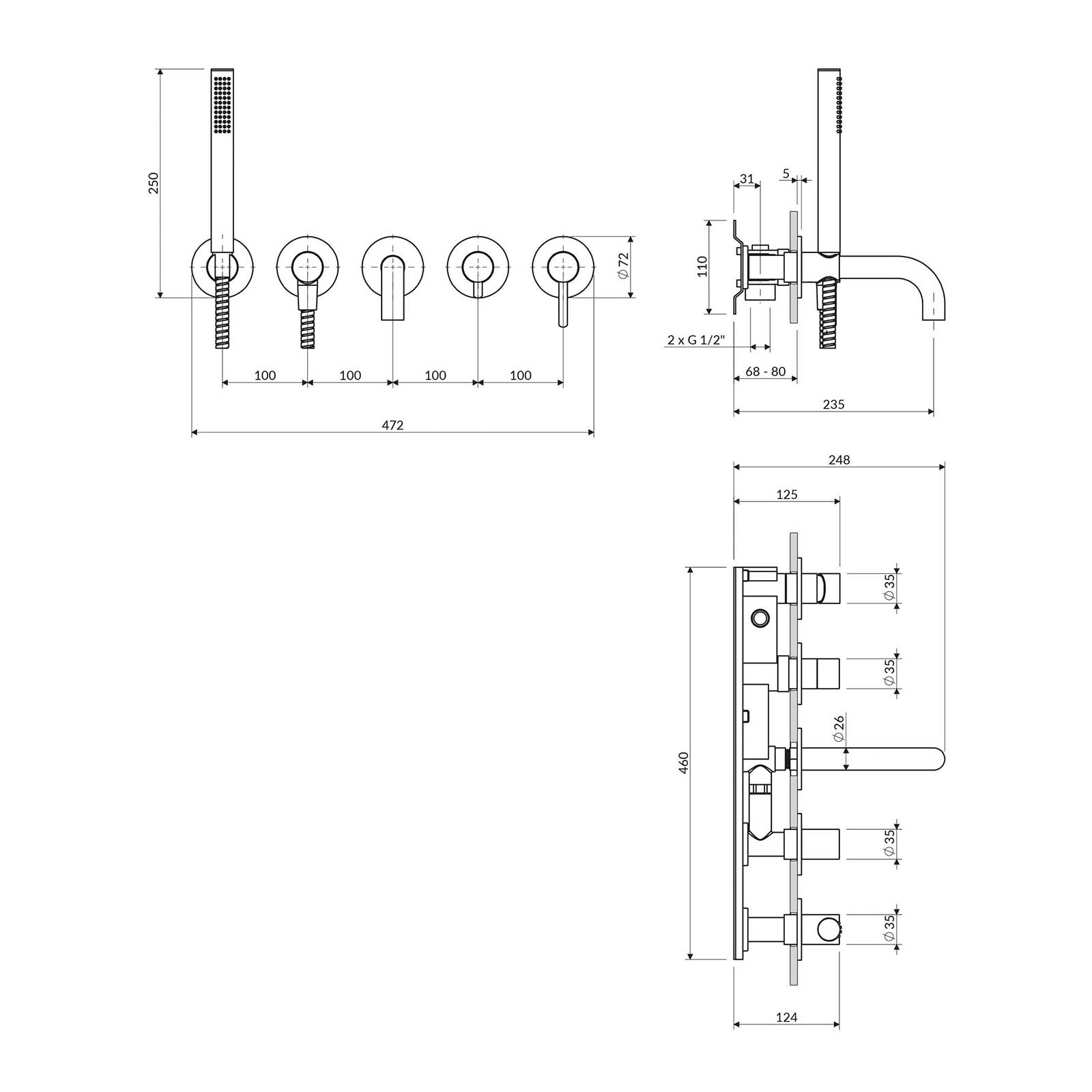 - zwei Eingänge (für Warm- und Kaltwasser): 1/2" Messing-Duschgriff