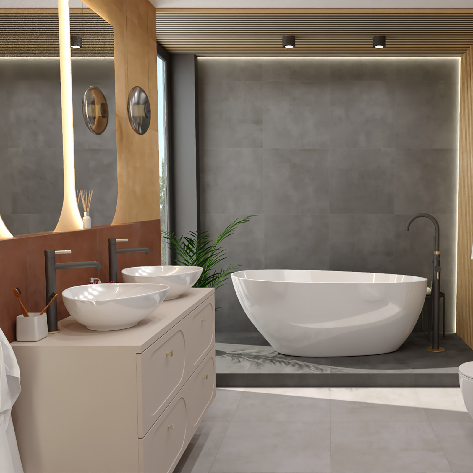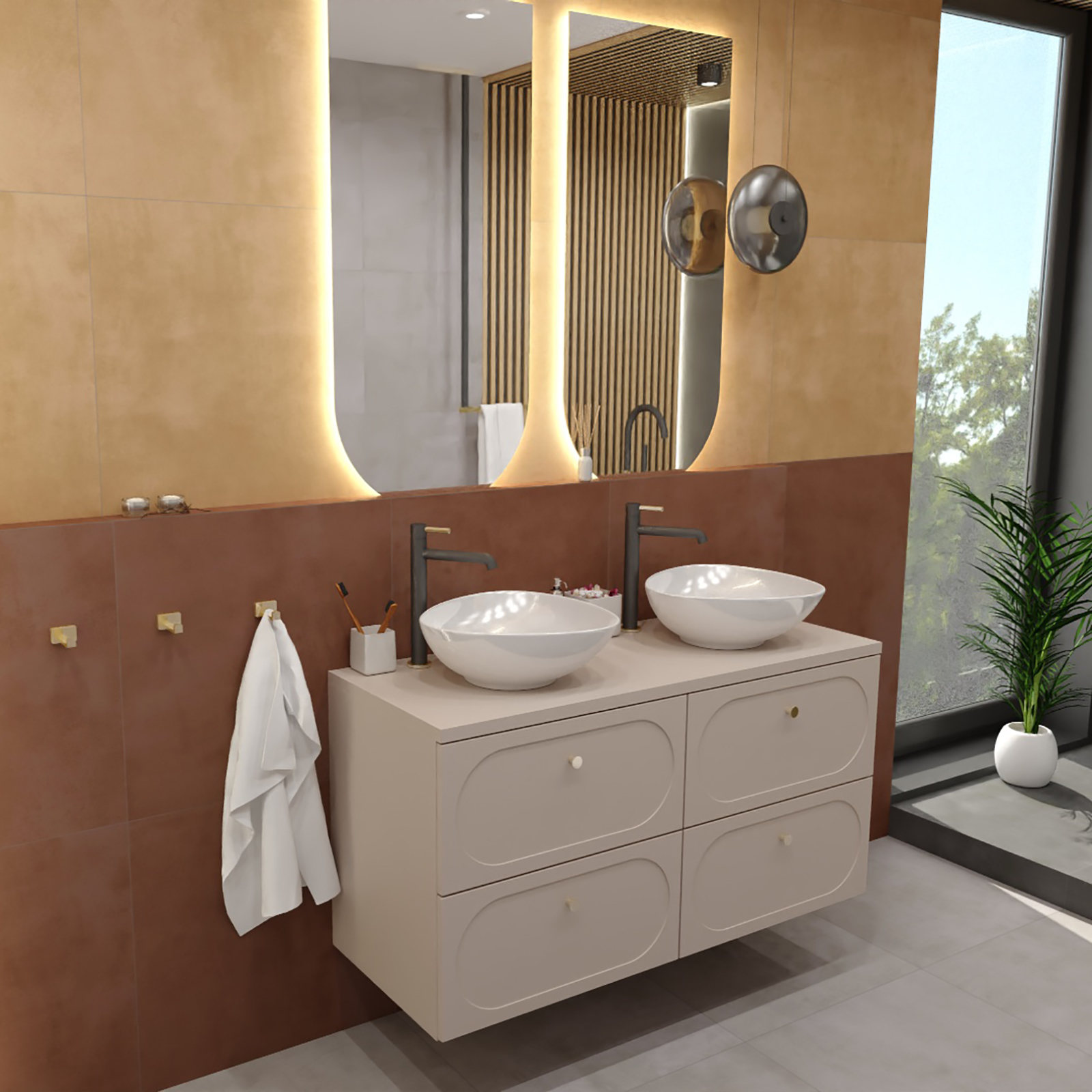 Wasserhahn im Waschbecken Y steht hoch schwarz und golden.