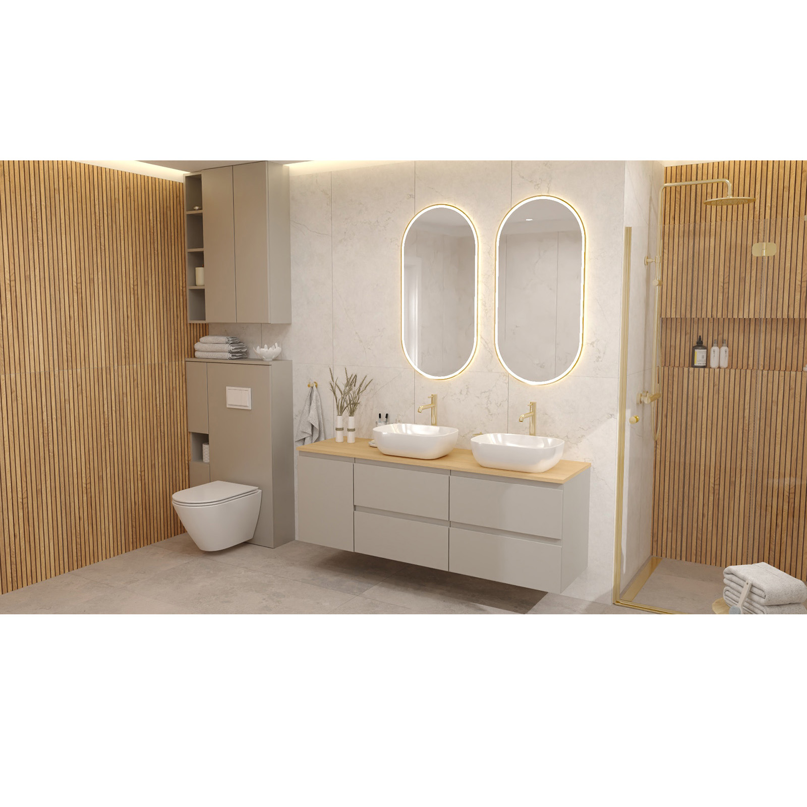 Die Schränke dieser Kollektion haben profilierte Fronten, die ein bequemes Öffnen ermöglichen. Dadurch müssen wir die Griffe nicht an andere Elemente des Badezimmers anpassen. Das Finish der Möbel wird immer universell sein.