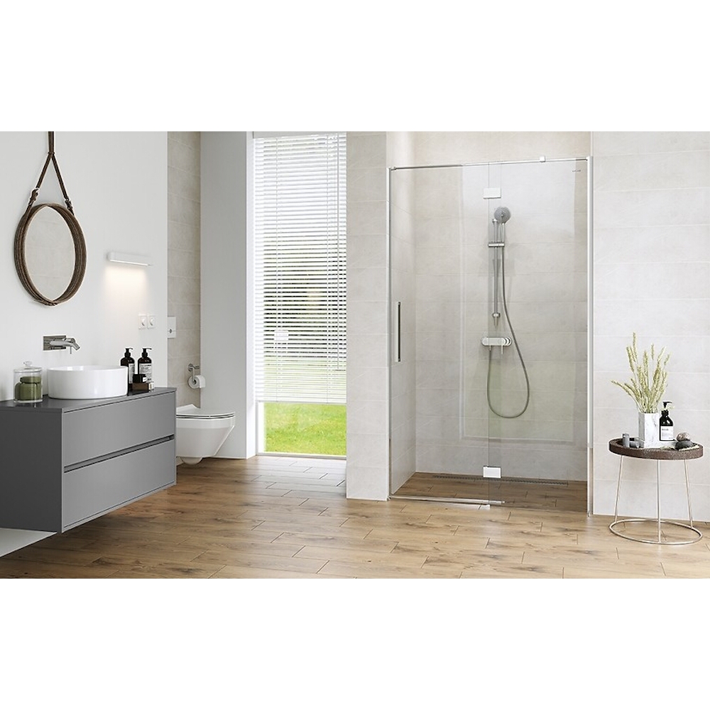 Duschkabinenwand CREA 90x200 transparentes Glas. Die CREA-Kabinenkollektion ist eine einzigartige Kollektion mit vielen praktischen Lösungen für den Benutzer. Das furnierverkleidete Klappscharnier passt mit seiner schlichten Form perfekt zu den aktuellen Trends. Schiebetüren mit geräuschloser Schließfunktion sorgen für Komfort bei der Nutzung. Die 8 mm dicke Verglasung und die Höhe der Kabine von 200 cm sind ein nicht zu vernachlässigender Vorteil. Ergänzt wird das Ganze durch ein ästhetisch ansprechendes Wandprofil mit verdecktem Beschlag, einen langen Metallgriff und eine Rinne, die das Wasser von der Tür in die Kabine ableitet. Inklusive Montagesatz.