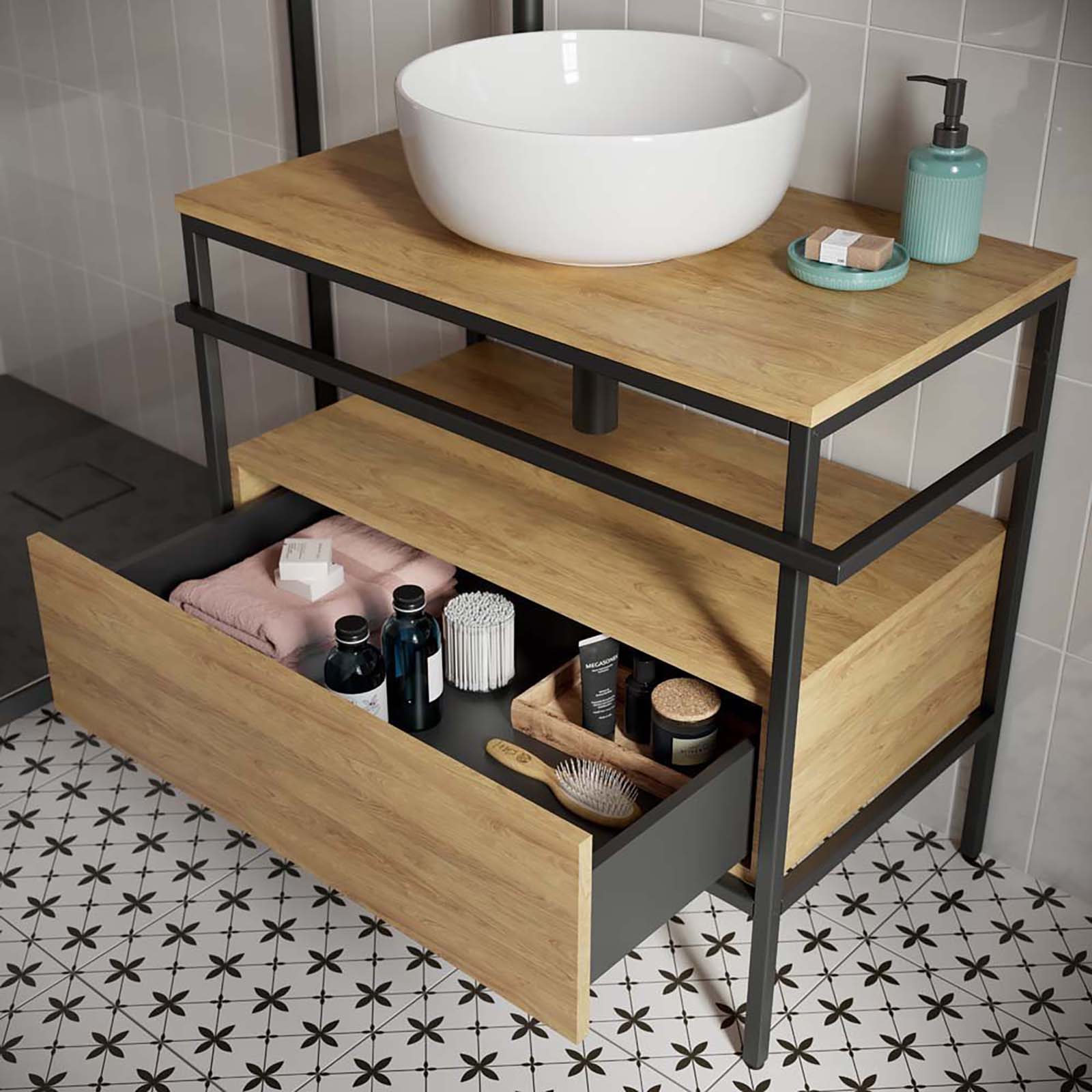 Die Konsole wird mit einer Arbeitsplatte kombiniert, die es uns ermöglicht, ein beliebiges Aufsatzwaschbecken zu wählen, und einem funktionalen Schrank mit Schublade.