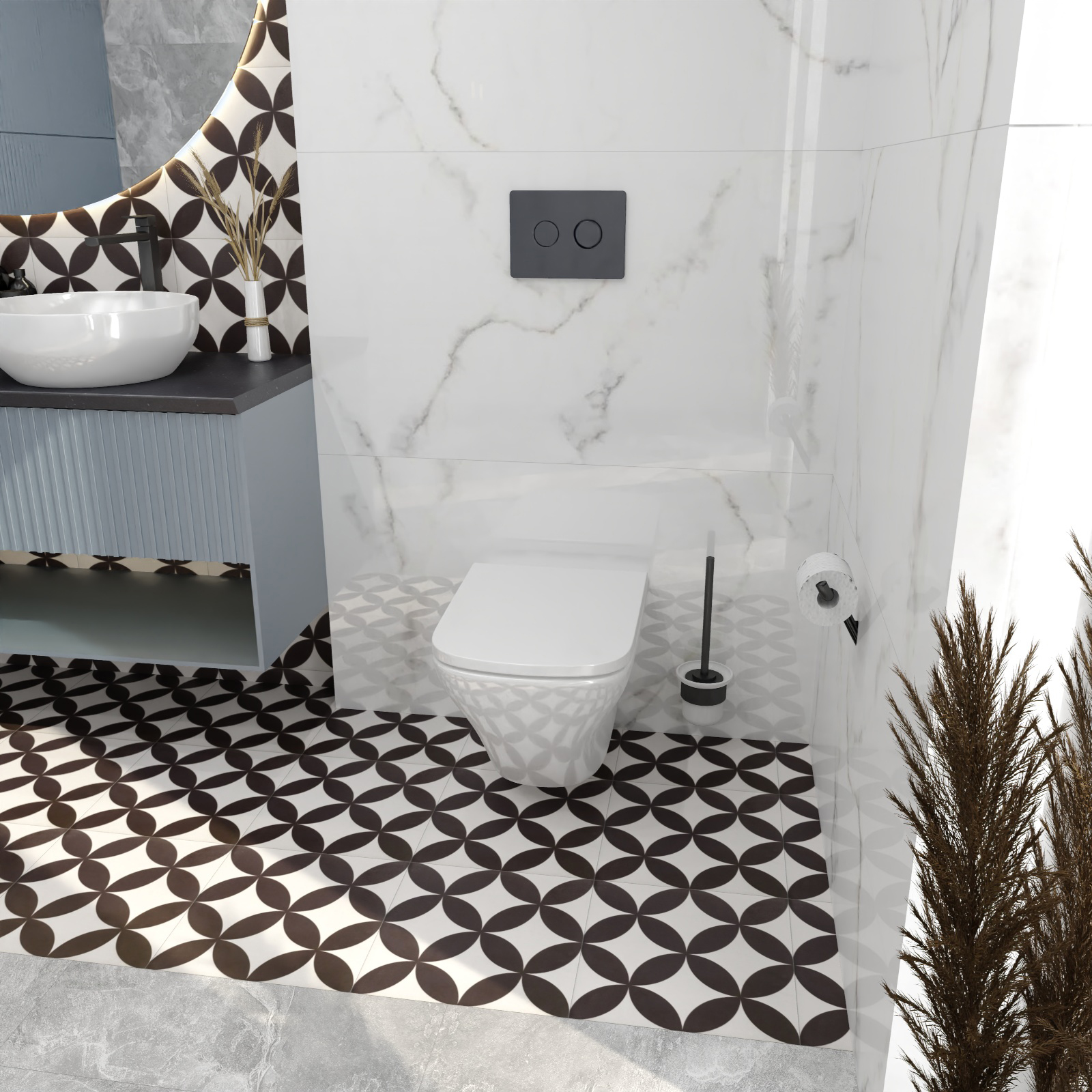 ACCENTO CIRCLE pneumatische Betätigungsplatte mit kreisförmigen Tasten. Sowohl die Oberfläche der Betätigungsplatte als auch die Tasten sind mit schwarzem Glas abgedeckt. Die Taste mit dem größeren Betätigungsbereich ragt leicht über die Oberfläche des Knopfes hinaus und hat eine abgeschrägte Kante. Die einheitliche, glänzende Oberfläche der Taste verleiht dem Bad einen Hauch von Klasse und passt zu jeder Einrichtung. Die Betätigungsplatte eignet sich für die Vorwandinstallationssysteme AQUA 5/7/9 und SYSTEM 5/7 und ist mit dem SYSTEM FRESH kompatibel. Sie funktioniert mit SYSTEM FRESH, der idealen Lösung in Kombination mit der flanschlosen CleanOn-Technologie, bei der das Fehlen eines Flansches den Einsatz von Erfrischungsmitteln nicht ausschließt. Diese komplette und moderne Lösung garantiert eine umfassende Hygiene in der Toilette.