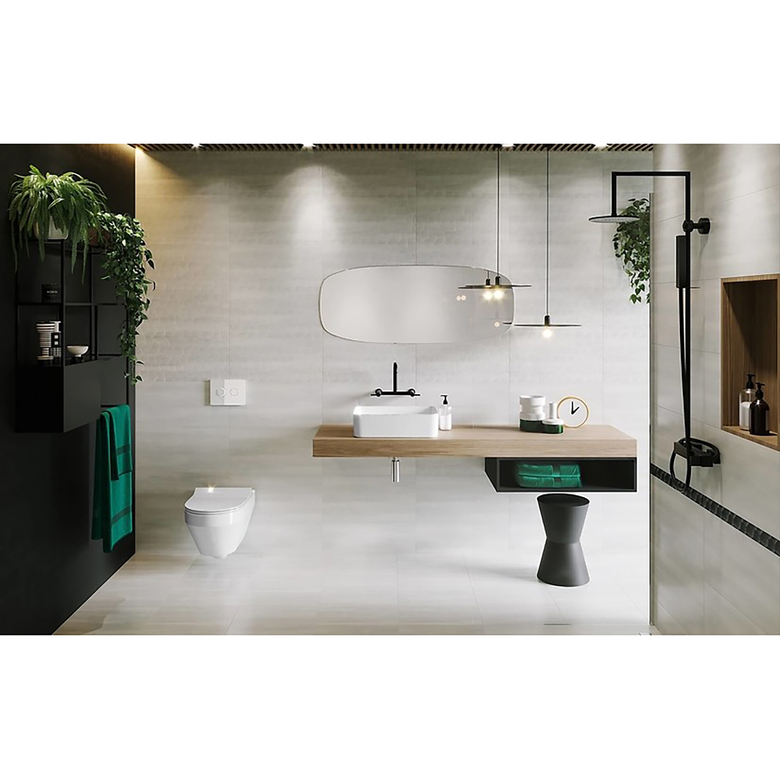 ACCENTO CIRCLE pneumatische Betätigungsplatte mit runden Betätigungsplatten. Sowohl die Betätigungsplatte als auch die Tasten sind mit weißem Glas abgedeckt. Die Taste mit dem größeren Betätigungsbereich ragt leicht über die Oberfläche des Knopfes hinaus und hat eine abgeschrägte Kante. Die einheitliche, glänzende Oberfläche der Taste verleiht dem Bad einen Hauch von Klasse und passt zu jeder Einrichtung. Die Betätigungsplatte eignet sich für die Vorwandinstallationssysteme AQUA 5/7/9 und SYSTEM 5/7 und ist mit dem SYSTEM FRESH kompatibel. Sie funktioniert mit SYSTEM FRESH, der idealen Lösung in Kombination mit der flanschlosen CleanOn-Technologie, bei der das Fehlen eines Flansches den Einsatz von Erfrischungsmitteln nicht ausschließt. Diese komplette und moderne Lösung garantiert eine umfassende Hygiene in der Toilette.