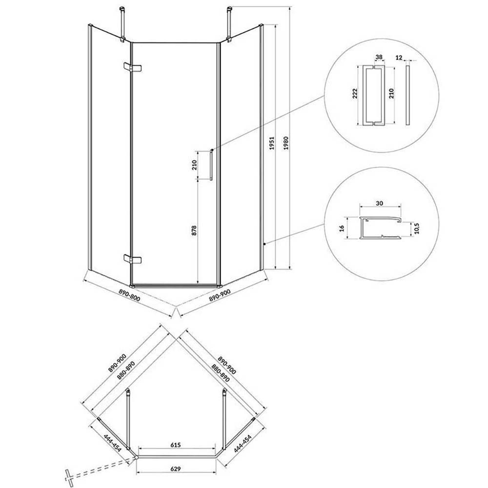Duschkabine fünfeckig JOTA links 90x90 Gold, transparentes Glas