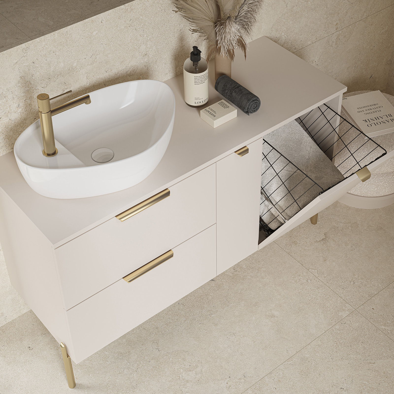 Ein innovatives Merkmal der Kollektion ist die Möglichkeit, ein Öffnungssystem zu wählen: klassischer Soft-Close mit Griff oder moderner Push-to-Open. Im Fall des Soft-Close-Systems kann der Kunde die Möbel zusätzlich personalisieren, indem er Möbelgriffe oder -beine in einer von drei stilvollen Varianten kauft: Chrom, schwarz matt oder gebürstetes Gold.