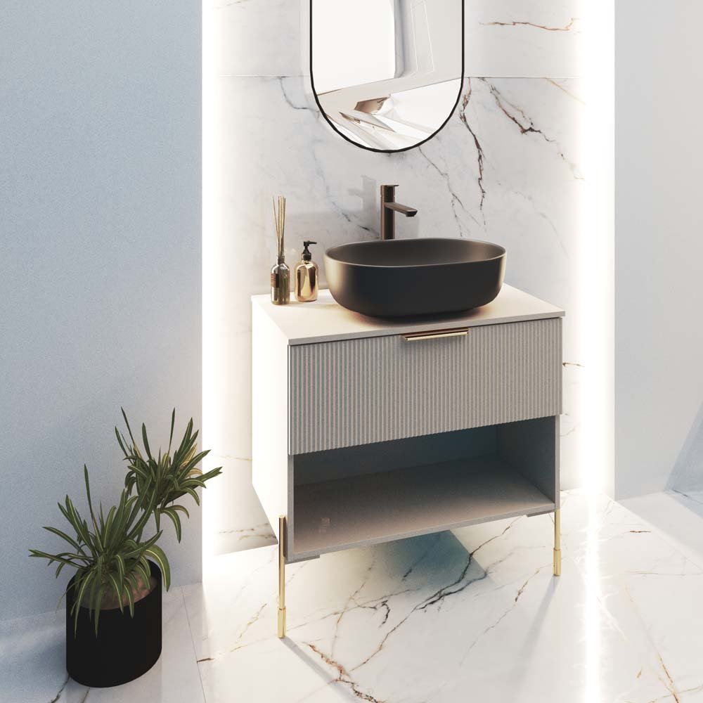 Er ist für Aufsatzwaschbecken konzipiert, mit denen er ein äußerst funktionales Set bildet und die beste Raumnutzung gewährleistet. Ihnen steht eine geräumige Schublade zur Verfügung, die ideal für Kosmetik und Badeaccessoires ist. Das offene Regal ist perfekt geeignet, um ordentlich gefaltete Handtücher oder dekorative Körbe mit Accessoires zu platzieren.