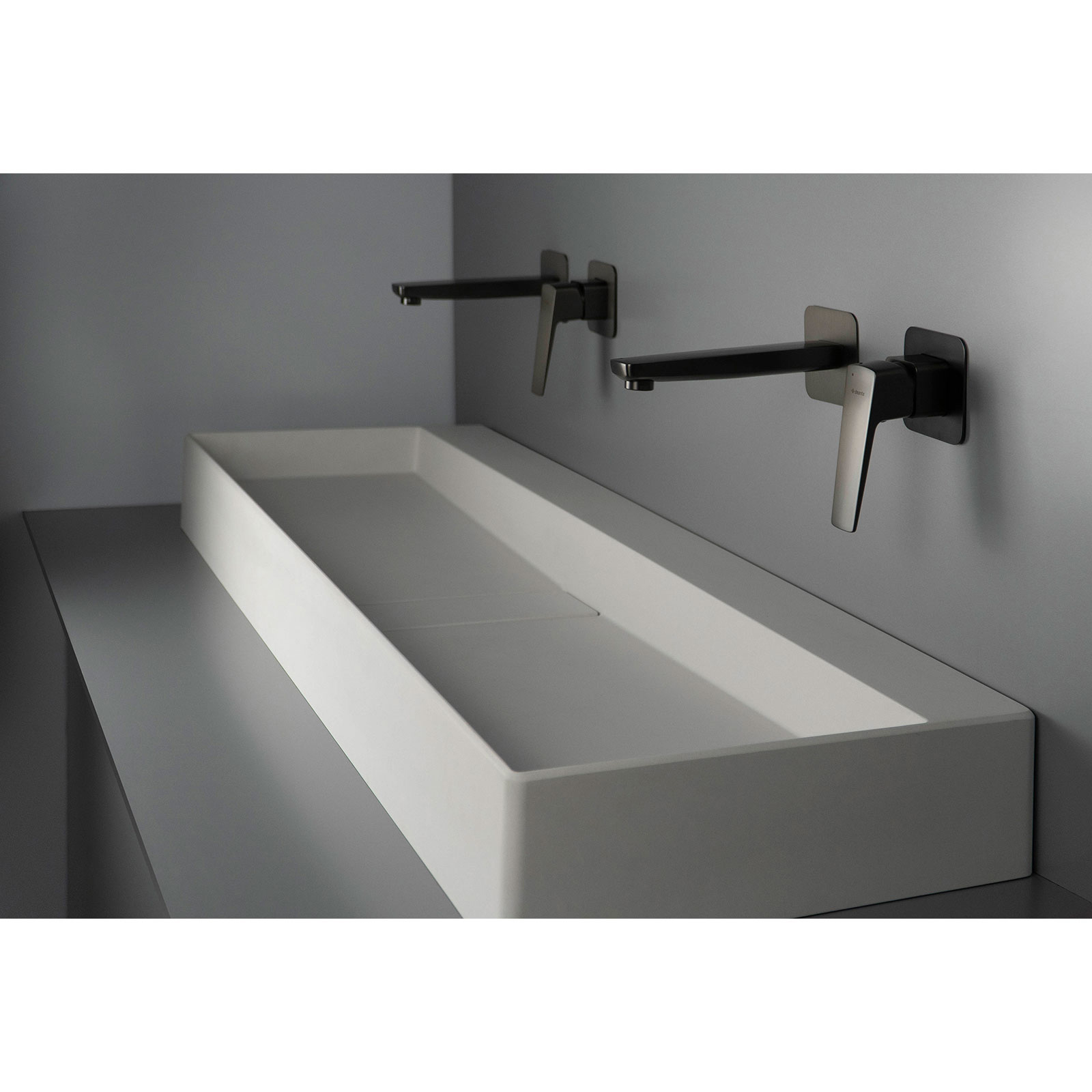 Blur Waschbecken mit verdecktem Wasserhahn, konzipiert für minimalistische Badezimmeranordnungen. Dank der bündig montierten Installation sind die meisten Wasserhahnelemente in der Wand verborgen, was für ein ästhetisches Erscheinungsbild des Raumes sorgt. Hergestellt aus hochwertigen Materialien wie Messing, sorgt sie für Langlebigkeit und Korrosionsbeständigkeit. Das matte Titan-Finish trägt zur Eleganz bei und fügt sich perfekt in moderne Waschbecken