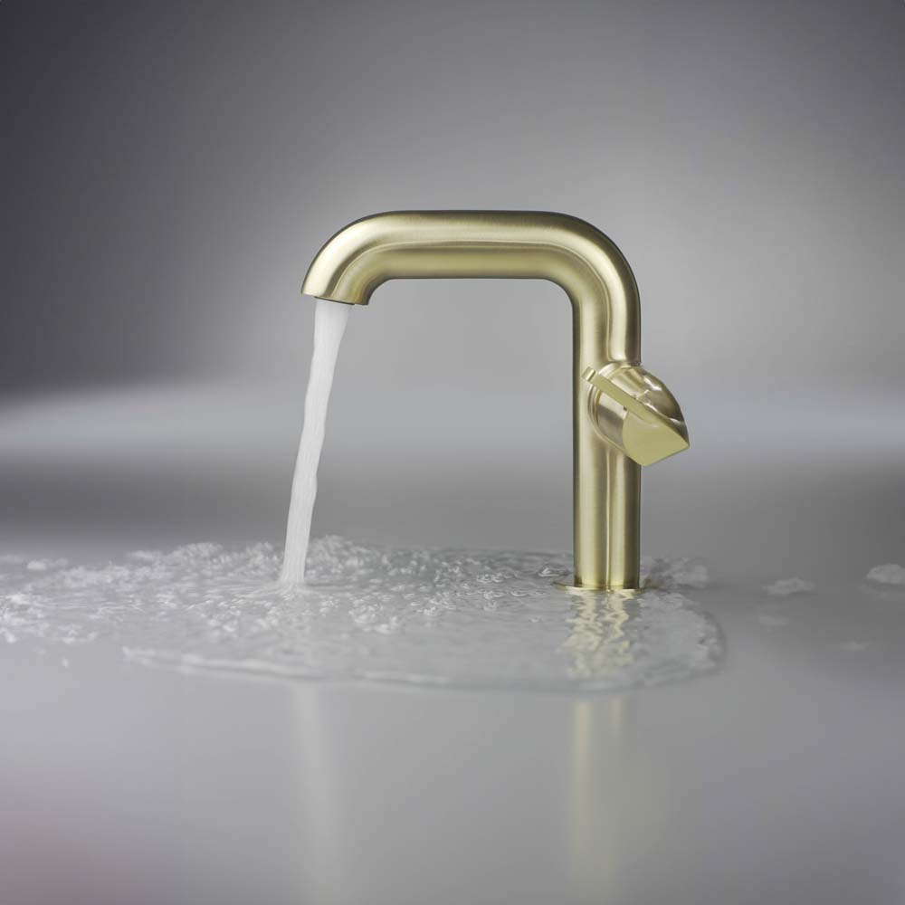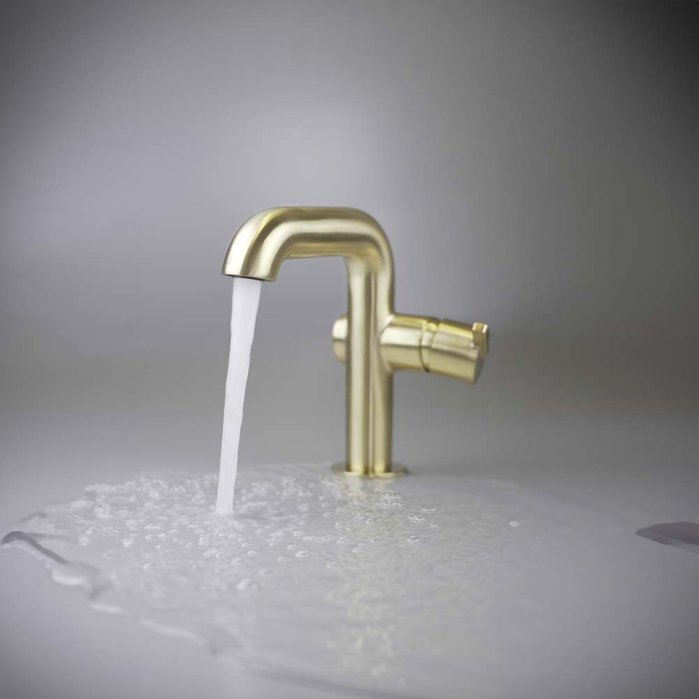 Ausguss Das Silia-Modell zeichnet sich durch eine schlanke, stromlinienförmige Form und einen sorgfältig gestalteten Hebel aus. Der seitliche Hebel sorgt dafür, dass der Wasserhahn während der Nutzung sauber bleibt, da deutlich weniger Flecken auf den Armaturen vorhanden sind. Sein würfelförmiger Griff verschmilzt harmonisch mit den Walzen des Korpus und des Ausgusses und schafft ein einzigartiges Design. Der Silia-Wasserhahn ist einfach und äußerst praktisch, was ihn perfekt zum Wabi-Sabi-Trend macht, der von japanischer Ästhetik inspiriert ist. Seine anspruchsvolle Geometrie und die große Farbvielfalt verleihen ihm ein originelles und außergewöhnliches Aussehen. Der Wasserhahn ist mit modischem gebürstetem Gold versehen.