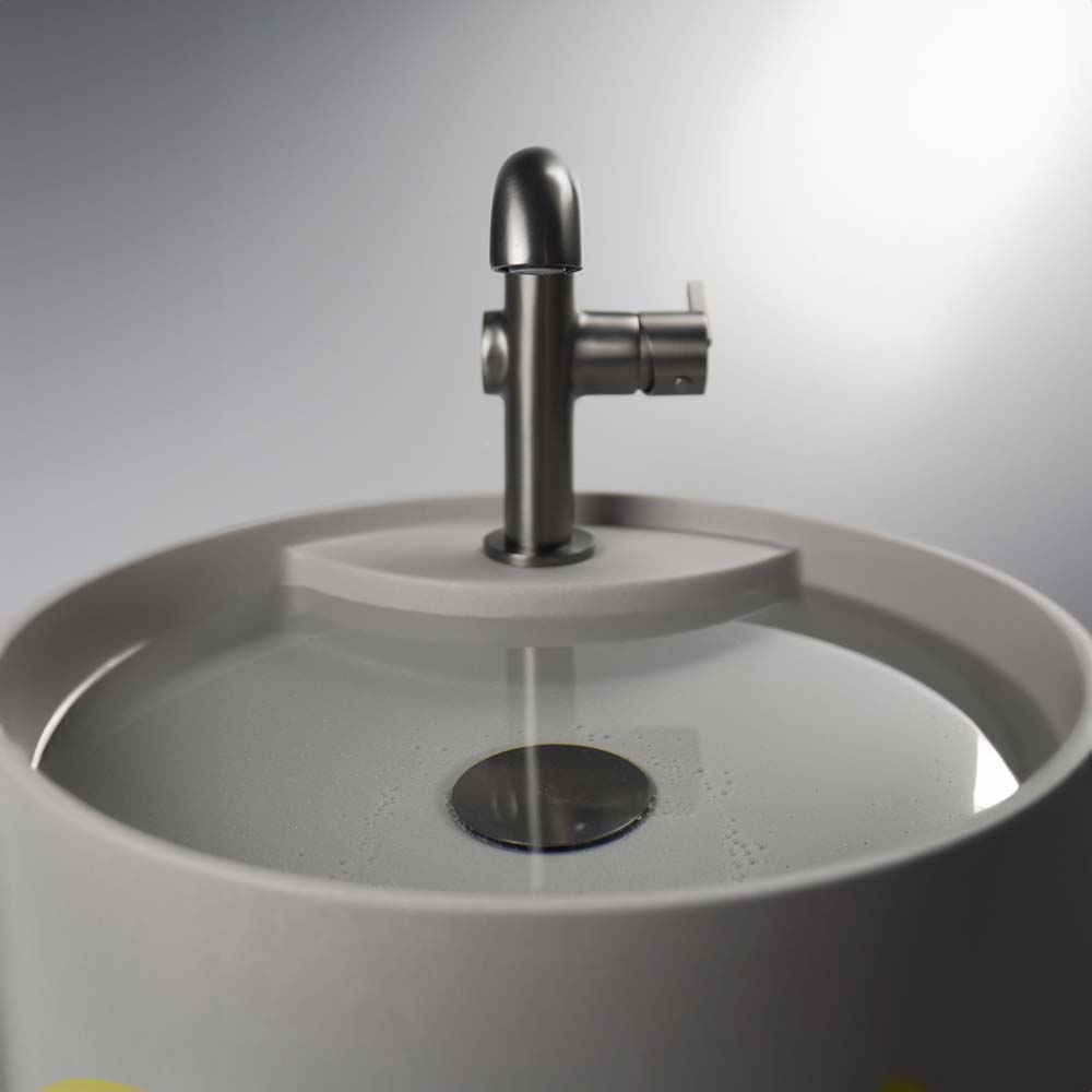 Dieses Modell zeichnet sich durch seine schlanke, stromlinienförmige Form und den sorgfältig durchdachten Hebel aus. Der Seitenhebel sorgt dafür, dass der Wasserhahn im Alltag sauber bleibt, da deutlich weniger Flecken auf den Armaturen vorhanden sind. Sein würfelförmiger Griff verschmilzt harmonisch mit den Walzen des Korpus und des Ausgusses und schafft ein einzigartiges Design. Der Silia-Wasserhahn ist einfach, bescheiden und äußerst praktisch, was ihn perfekt zum Wabi-Sabi-Trend macht, der von japanischer Ästhetik inspiriert ist. Andererseits verleihen seine anspruchsvolle Geometrie und die große Farbvielfalt ihm ein originelles und ungewöhnliches Aussehen. Der Wasserhahn ist in der ursprünglichen Titanfarbe lackiert, die eine Kombination aus Schwarz, Braun und Grau ist.