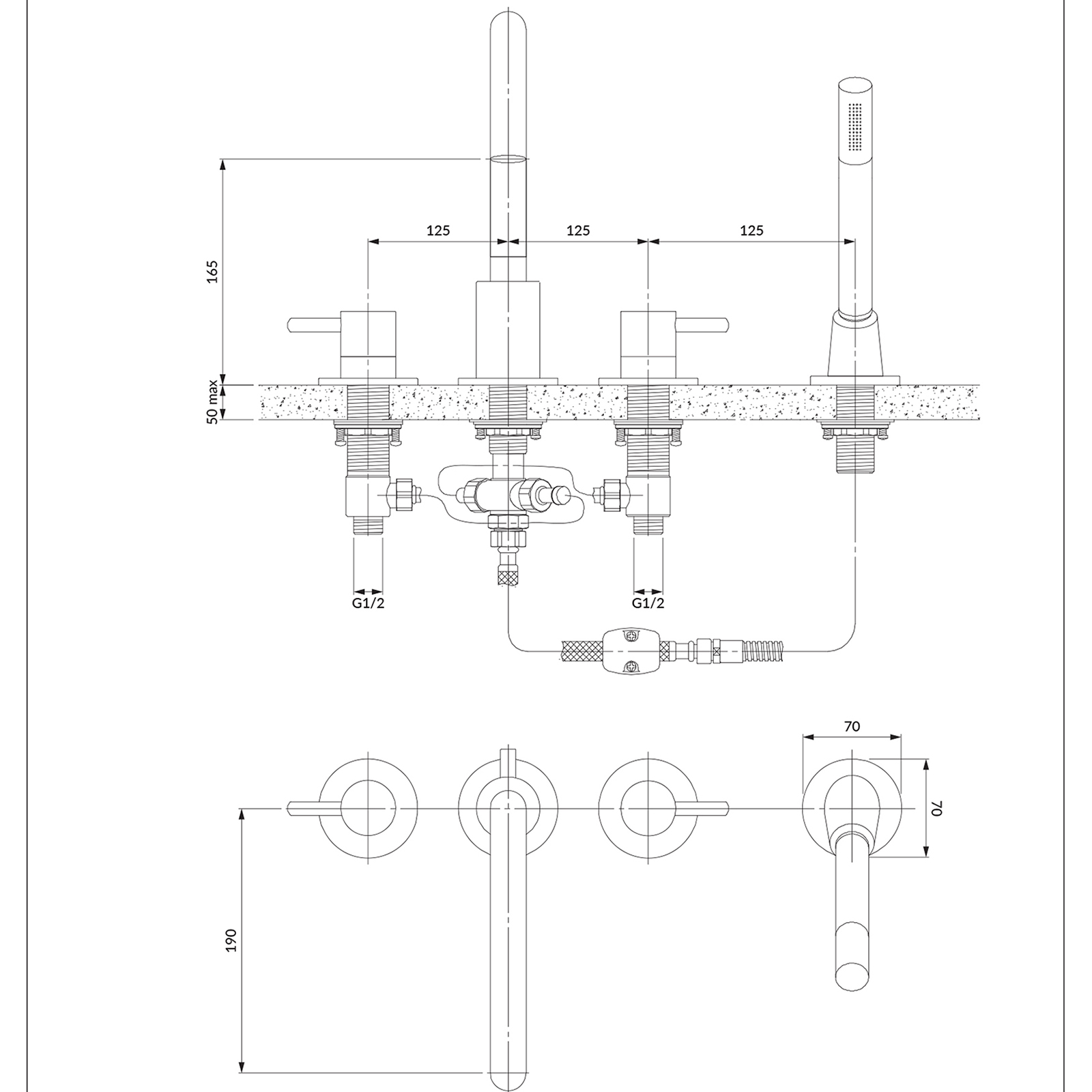 Badewannenhahn Y 4-Loch Gold gebürstet.