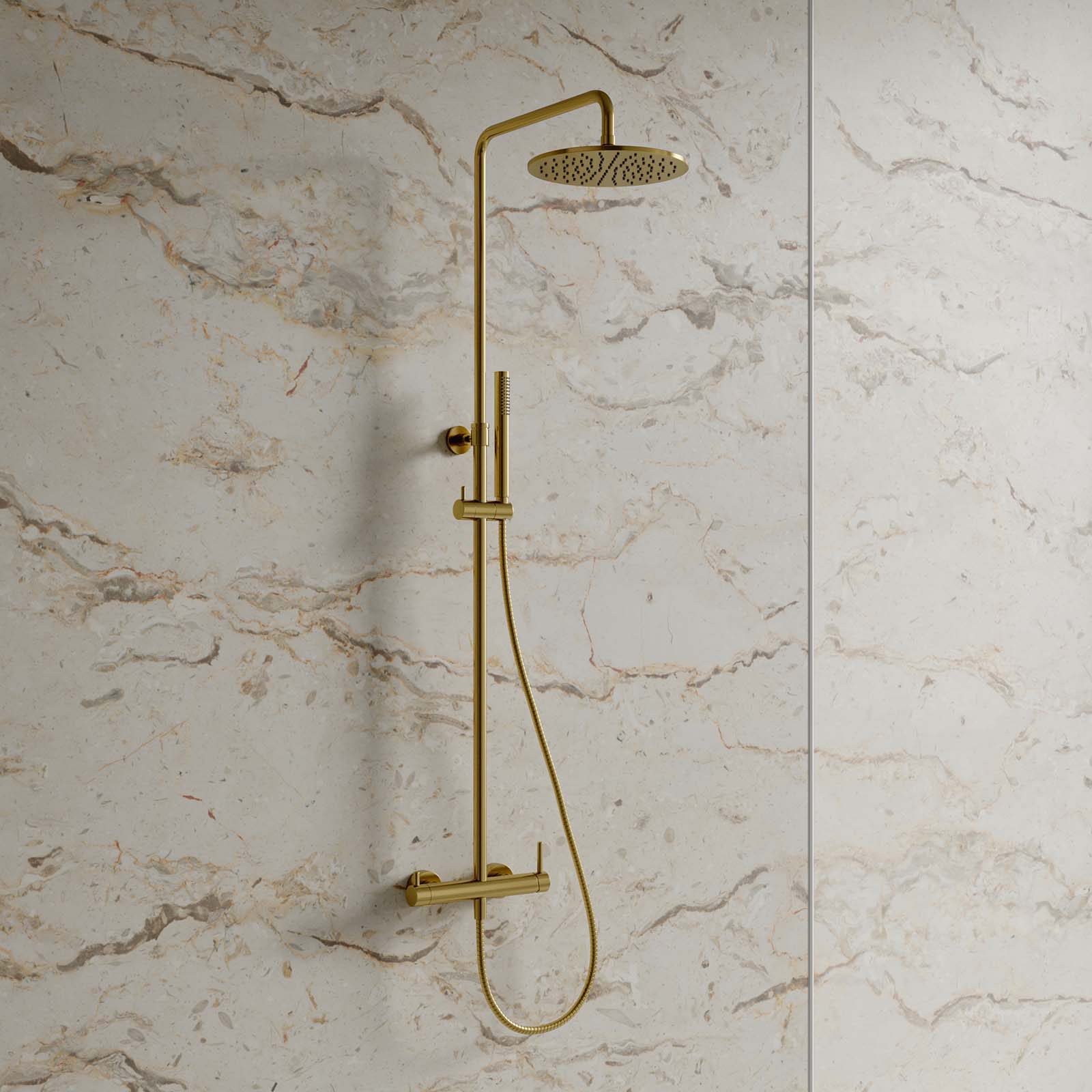 Duschsystem Y oberflächenmontiertes Gold gebürstet.